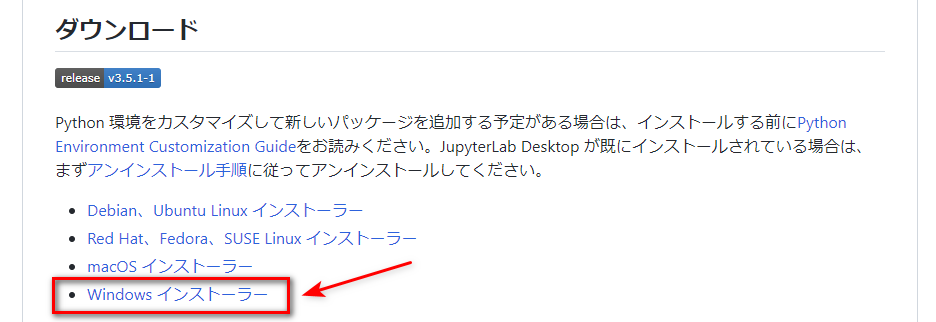 JupyterプロジェクトのJupyterLabのGitHubページからインストーラーをダウンロード。